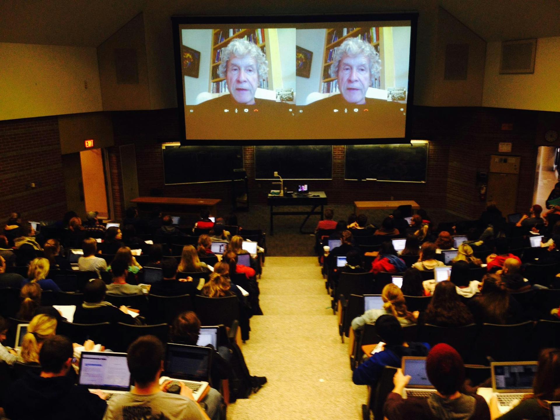I have instructed courses for the Department of Political Science at the University of Guelph since 2009. I continue to instruct the department's introductory International Political Economy (IPE) (POLS*3790) course (now titled Money, Power and Global Politics), and I also instruct other courses on the politics of the global economy, including POLS*4200 and POLS*6730. I was one of the very first instructors at Guelph to utilize new technologies to enable experts to visit our undergraduate classrooms virtually. In the photo to the right, New York Times bestselling author John Perkins visits my POLS*2080 class back in 2011. Check out a reel that my students in POLS*4200 made in 2025 on why studying IPE matters in their everyday lives.